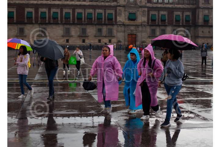 CIUDAD DE MÉXICO, 22JUNIO2025.- Visitantes del Centro Histórico se resguardan de la lluvia en la Plancha del Zócalo. FOTO: ANDREA MURCIA /CUARTOSCURO.COM