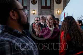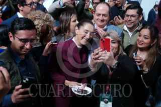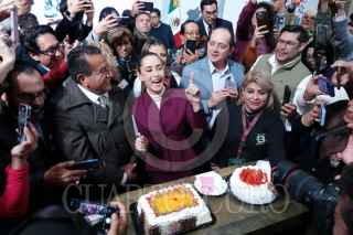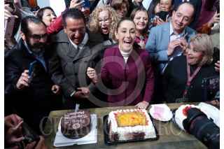 CIUDAD DE MÉXICO, 24JUNIO2025.- Al termino de la conferencia matutina, la presidenta Claudia Sheinbaum Pardo partió y compartió su pastel de cumpleaños 63 con las y los representantes de la prensa. FOTO: GALO CAÑAS/CUARTOSCURO.COM