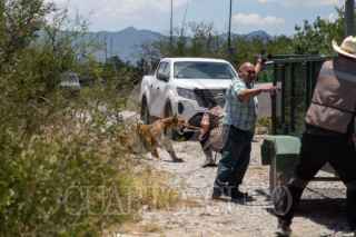 SALINAS VICTORIA, NUEVO LEÓN, 25JUNIO2025.- Un tigre de bengala es conducido a una jaula por su propietario tras haberse escapado. El ejemplar, de 11 meses de edad, fue avistado en el predio “La Copina”, en el municipio de Salinas Victoria, Nuevo León. Al lugar acudieron elementos de Protección Civil estatal, resguardo de vida silvestre y Fuerza Civil para su localización y captura. De acuerdo con el director de Protección Civil, Erick Cavazos, el dueño del tigre —identificado como “Alan”— cuenta con los permisos correspondientes de PROFEPA y colaboró en el operativo. FOTO: PROTECCIÓN CIVIL NL / CUARTOSCURO.COM