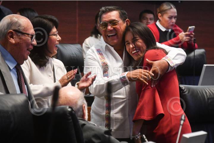CIUDAD DE MÉXICO, 26JUNIO2025.- Félix Salgado, senador de Morena, abraza a su compañera de bancada Simey Olvera, previo al inicio de la sesión extraordinaria del Senado de la República en la que se discute la Ley Reglamentaria del Servicio Ferroviario y la minuta por la que el Instituto Nacional de Estadística, Geografía e Informática (Inegi) asumirá las funciones del Consejo Nacional de Evaluación de la Política de Desarrollo Social (Coneval). FOTO: MARIO JASSO/CUARTOSCURO.COM