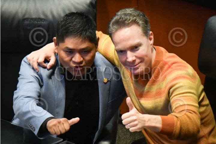 CIUDAD DE MÉXICO, 26JUNIO2025.- Los senadores del PVEM: Erasmo Catarino y Manuel Velasco, durante la sesión extraordinaria del Senado de la República en la que se discute la Ley Reglamentaria del Servicio Ferroviario y la minuta por la que el Instituto Nacional de Estadística, Geografía e Informática (Inegi) asumirá las funciones del Consejo Nacional de Evaluación de la Política de Desarrollo Social (Coneval). FOTO: MARIO JASSO/CUARTOSCURO.COM