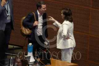 CIUDAD DE MÉXICO 28JUNIO2025.- Ricardo Anaya y Lilly Téllez, senadores por el Partido Acción Nacional, durante la sesión extraordinaria del Senado de la República FOTO:ROGELIO MORALES /CUARTOSCURO.COM