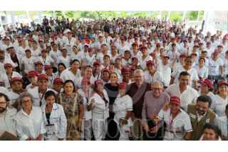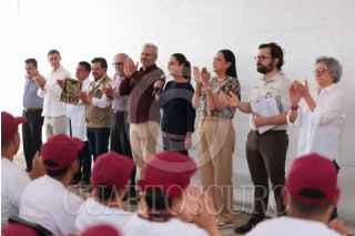 AQUILA, MICHOACÁN, 28JUNIO2025.- Ariadna Montiel, secretaria del Bienestar; Claudia Sheinbaum, presidenta de México; Alfredo Ramírez Bedolla, gobernador de Michoacán; David Kershenobich, secretario de Salud, y Zoé Robledo, director general del IMSS, durante el arranque de la campaña Salud Casa Por Casa en la entidad. Iniciativa que busca beneficiar a las personas mayores y en condiciones de vulnerabilidad. FOTO: PRESIDENCIA/CUARTOSCURO.COM