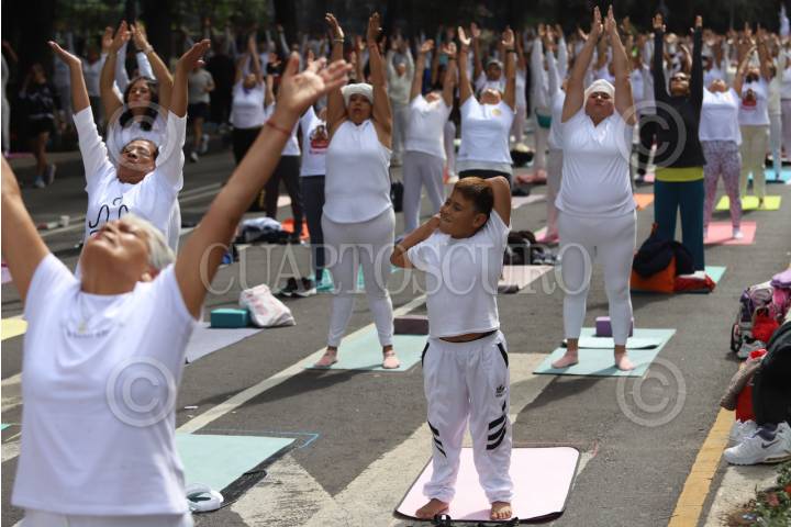 CIUDAD DE MÉXICO, 29JUNIO2025.- Un infante práctica Yoga en medio de más personas durante la clase masiva que se impartió este domingo en el Ángel de la Independencia. FOTO: DANIEL AUGUSTO/ CUARTOSCURO.COM