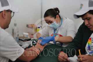 CIUDAD DE MÉXICO, 29JUNIO2025.- Personal médico del Instituto Mexicano del Seguro Social (IMSS) realiza una prueba rápida de detección de VIH durante la edición 47 de la Marcha del Orgullo LGBTTTIQAP+. En un módulo instalado frente al Edificio Central del IMSS, se aplicaron mil 540 pruebas gratuitas —768 para VIH y 772 para Hepatitis C—, además de brindar asesoría e información preventiva. FOTO: IMSS/CUARTOSCURO.COM