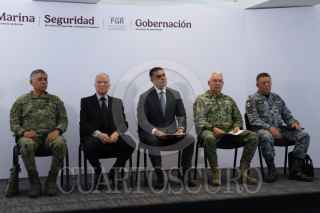 CIUDAD DE MÉXICO, 29JUNIO2025.- El gabinete de seguridad, integrado por el titular de la SSPC, Omar García Harfuch, el fiscal general de la república, Alejandro Gertz Manero, los secretarios de Defensa y Marina, Ricardo Trevilla Trejo y Raymundo Morales, y el titular de la Guardia Nacional, Hernán Cortés, ofrecieron una conferencia de prensa para anunciar la detención de un grupo delictivo dedicado al huachicoleo. FOTO: DANIEL AUGUSTO/ CUARTOSCURO.COM