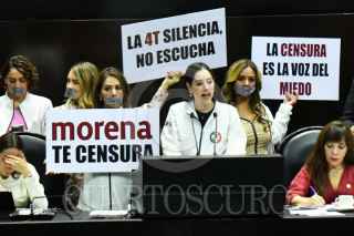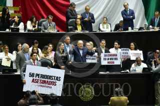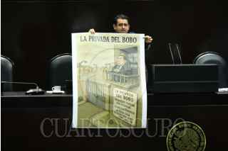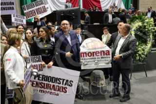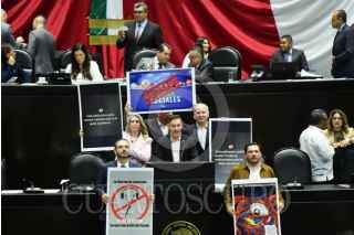 CIUDAD DE MÉXICO, 01JULIO2025.- Diputados priístas colocaron un féretro y una corona fúnebre con la leyenda "Murió la libertad" durante la participación de Erubiel Alonso en la sesión extraordinaria de la Cámara de Diputados en la que se aprobó la ley federal de Telecomunicaciones y Radiodifusión. FOTO: MARIO JASSO/CUARTOSCURO.COM