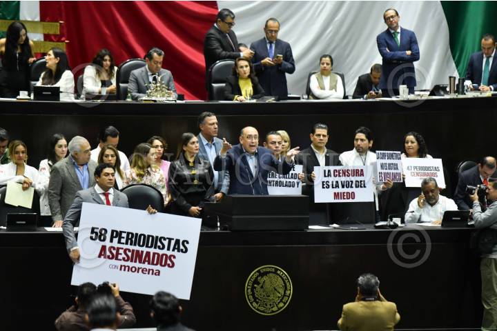 CIUDAD DE MÉXICO, 01JULIO2025.- Rubén Moreira, diputado y coordinador del PRI, junto a sus compañeros de bancada, muestran cartulinas en contra de la ley federal de Telecomunicaciones y Radiodifusión. Además los priístas mostrarán una cartulina con la leyenda "58 periodistas asesinados con Morena". FOTO: MARIO JASSO/CUARTOSCURO.COM