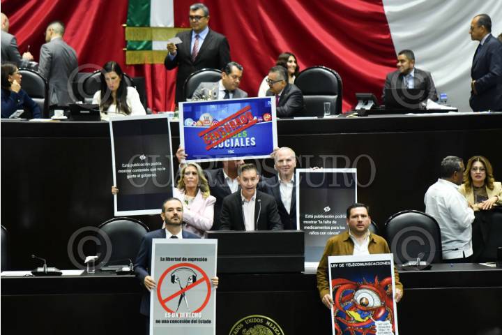 CIUDAD DE MÉXICO, 01JULIO2025.- José Mario Íñiguez, diputado del PAN, y sus compañeros de bancada protestan en contra de la ley federal de Telecomunicaciones y Radiodifusión, durante la sesión extraordinaria de la Cámara de Diputados. FOTO: MARIO JASSO/CUARTOSCURO.COM