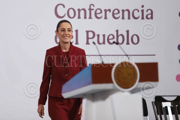 CIUDAD DE MÉXICO, 02JULIO2025.- La presidenta de México, Claudia Sheinbaum, llega al Salón Tesorería de Palacio Nacional para iniciar la Conferencia del Pueblo de este miércoles. FOTO: DANIEL AUGUSTO/ CUARTOSCURO.COM