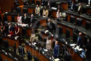 CIUDAD DE MÉXICO, 03JULIO2025.- Legisladores durante el minuto de silencio en memoria de Violeta Barrios de Chamorro quien fue la primer mujer elegida presidenta de la República de Nicaragua, otorgado en la sesión de la Comisión Permanente en la que se realizaron la presentación de iniciativas por parte de los grupos parlamentarios. FOTO: MARIO JASSO/CUARTOSCURO.COM