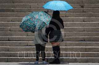 CIUDAD DE MÉXICO, 03JULIO2025.-Jovenes se protegen con paraguas de los rayos del sol enfre de las escaleras del Ángel de la Independecia. FOTO: GRACIELA LÓPEZ/CUARTOSCURO.COM