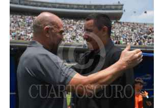 CIUDAD DE MÉXICO, 06JULIO2025.- Los directores técnicos Francisco "Paco" López (Club Deportivo Leganés), y Efraín Juárez (Club Pumas) se saludaron al inicio del partido amistoso entre Pumas y Leganés realizado en el Estadio Olímpico Universitario. FOTO: GRACIELA LÓPEZ/CUARTOSCURO.COM