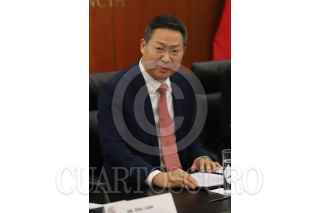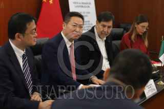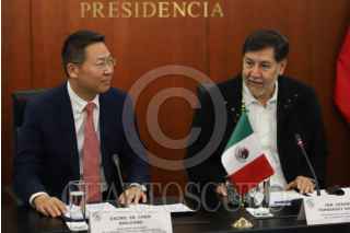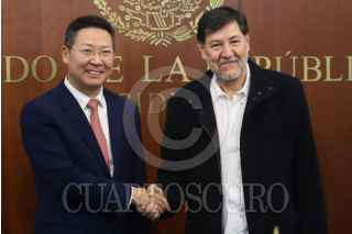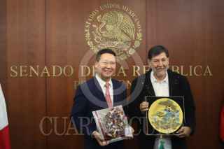 CIUDAD DE MÉXICO, 07JULIO2025.- El embajador de China en México, Chen Daojiang, saluda al presidente del Senado, Gerardo Fernández Noroña. FOTO: DANIEL AUGUSTO/ CUARTOSCURO.COM