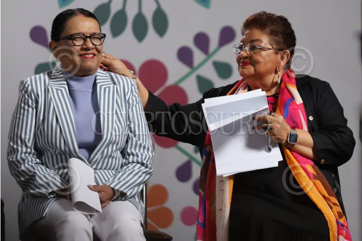 CIUDAD DE MÉXICO, 08JULIO2025.- La consejera jurídica de la presidencia, Ernestina Godoy, observa los aretes que lleva la secretaria de Gobernación, Rosa Icela Rodríguez. FOTO: DANIEL AUGUSTO/ CUARTOSCURO.COM