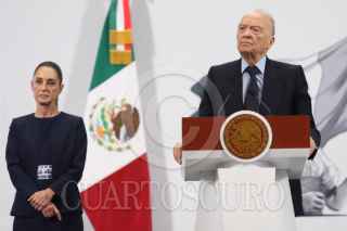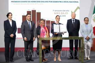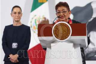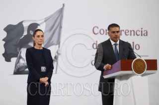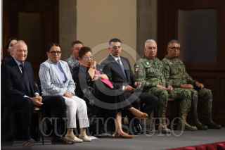 CIUDAD DE MÉXICO, 08JULIO2025.- Integrantes del gabinete de seguridad, encabezados por el secretario de Seguridad y Protección Ciudadana, Omar García Harfuch, el fiscal General de la República, Alejandro Gertz Manero, el titular de la Defensa, Ricardo Trevilla Trejo, el secretario de Marina, Raymundo Morales, la secretaria de Gobernación, Rosa Icela Rodríguez y la consejera jurídica de la presidencia, Ernestina Godoy, durante la conferencia matutina de este martes. FOTO: DANIEL AUGUSTO/ CUARTOSCURO.COM
