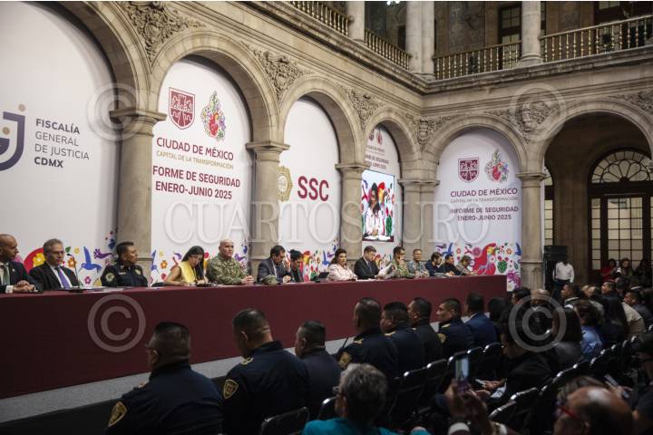 CIUDAD DE MÉXICO, 08JULIO2025.- Clara Brugada, Jefa de Gobierno, acompañada de Bertha Alcalde Luján, Fiscal general de justicia; Pablo Vázquez Camacho, secretario de Seguridad Ciudadana (SSC), y el gabinete de seguridad encabezaron el Informe de Seguridad, que se llevo a cabo en el Antiguo Palacio del Ayuntamiento. FOTO: ANDREA MURCIA /CUARTOSCURO.COM