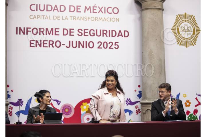 CIUDAD DE MÉXICO, 08JULIO2025.- Clara Brugada, Jefa de Gobierno, acompañada de Bertha Alcalde Luján, Fiscal general de justicia; Pablo Vázquez Camacho, secretario de Seguridad Ciudadana (SSC), y el gabinete de seguridad encabezaron e Informe de Seguridad, que se llevo a cabo en el Antiguo Palacio del Ayuntamiento. FOTO: ANDREA MURCIA /CUARTOSCURO.COM