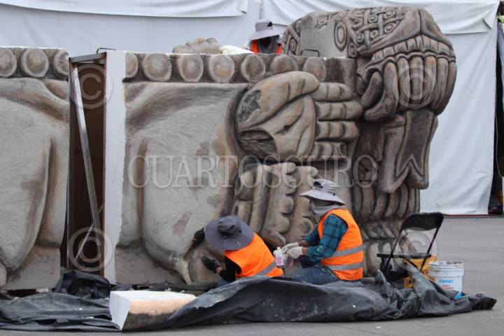 CIUDAD DE MÉXICO, 09JULIO2025.- Trabajadores pintan y resanan una parte de una escultura mexica monumental en el Zócalo capitalino. Estás actividades forman parte de la preparación del espectáculo de videomaping "Memoria Luminosa. México-Tenochtitlán, 700 años", una experiencia audiovisual que conmemorará la fundación de la capital como Imperio Mexica en la Plaza de la Constitución. Del 11 al 27 de julio habrá funciones al público en general en horarios de 20 y 21:30hrs. FOTO: GRACIELA LÓPEZ/CUARTOSCURO.COM