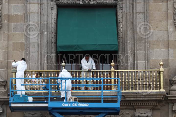 CIUDAD DE MÉXICO, 09JULIO2025.- Trabajadores pintan y resanan el balcón presidencial de Palacio Nacional previo al espectáculo de videomaping "Memoria Luminosa. México-Tenochtitlán, 700 años", una experiencia audiovisual que conmemorará la fundación de la capital como Imperio Mexica en la Plaza de la Constitución. Del 11 al 27 de julio habrá funciones al público en general en horarios de 20 y 21:30hrs. FOTO: GRACIELA LÓPEZ/CUARTOSCURO.COMt