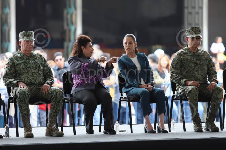 CIUDAD DE MÉXICO, 09JULIO2025.- Claudia Sheinbaum, presidenta de México y la jefa de gobierno, Clara Brugada, dialogan durante el evento de esta mañana. FOTO: DANIEL AUGUSTO/ CUARTOSCURO.COM