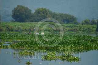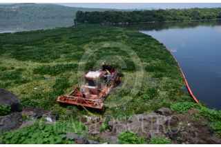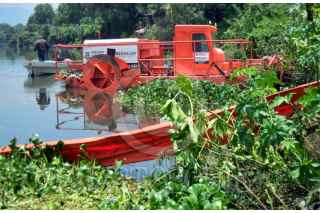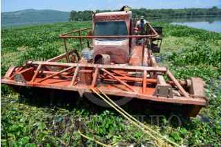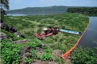 TULA DE ALLENDE, HIDALGO, 09JULIO2025.- El gobierno de México utiliza una barrera para contener el lirio en la presa Endhó, a fin de triturarlo después con maquinaria del gobierno de Hidalgo, y así combatir paralelamente la presencia de mosco en este embalse al que llegan las descargas residuales del Valle de México y su zona metropolitana. FOTO: FRANCISCO VILLEDA/CUARTOSCURO.COM