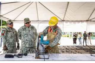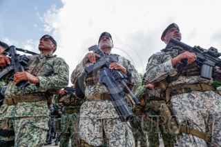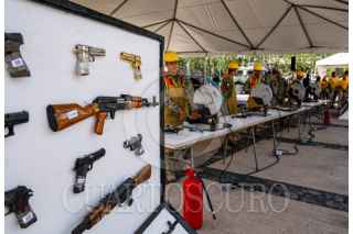 CULIACÁN, SINALOA, 09JULIO2025.- Este jueves, en la explanada del Palacio de Gobierno de Sinaloa, se llevó a cabo un acto simbólico para la destrucción de armas de fuego, organizado por la Defensa, en coordinación con autoridades estatales y municipales. Durante la ceremonia, encabezada por representantes del Ejército Mexicano y autoridades civiles, se mostraron públicamente diversas armas cortas y largas algunas de grueso calibre que fueron previamente aseguradas en operativos realizados en distintas regiones de la entidad. Con maquinaria especializada, los elementos castrenses procedieron a inutilizar decenas de armas, marcando así un compromiso institucional por la pacificación del estado. FOTO: JOSÉ BETANZOS ZÁRATE/CUARTOSCURO.COM