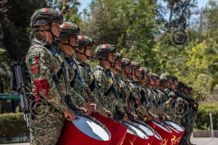 TIJUANA BAJA CALIFORNIA 09JULIO2025.- Militares de la banda de guerra, durante la ceremonia de destrucción de armas. En el marco del Día Internacional de Destrucción de Armas de Fuego se realizó una ceremonia en la Segunda Zona Militar de Tijuana donde se destruyeron armas aseguradas por autoridades. El comandante Javier Juvencio Hernández destacó el trabajo conjunto de los tres niveles de gobierno para reducir la violencia mediante el aseguramiento y destrucción de armamento. La gobernadora Marina del Pilar informó que Baja California ocupa el cuarto lugar nacional en canje de armas, con 200 armas retiradas de enero a junio. FOTOS CHRIS NOYOLA / CUARTOSCURO.COM