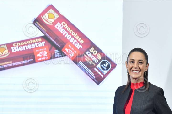 CIUDAD DE MÉXICO, 10JULIO2025.- Claudia Sheinbaum, presidenta de México, durante la conferencia matutina realizada en Palacio Nacional en la que se presentó la línea de Chocolate Bienestar, en sus versiones de mesa, en barra y en polvo. FOTO: MARIO JASSO/CUARTOSCURO.COM