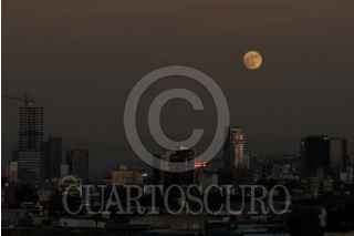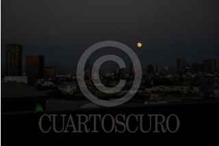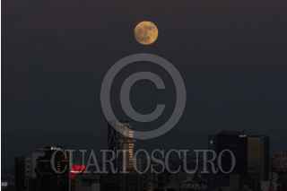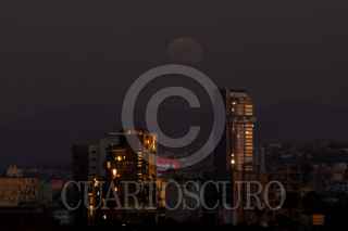 TIJUANA, BAJA CALIFORNIA, 09JULIO2025.- Los edificios de la ciudad fronteriza se iluminan con los últimos rayos de sol, mientras al fondo, se pudo apreciar la imponente luna, que el próximo viernes llegará a su fase de plenilunio. FOTO: OMAR MARTÍNEZ / CUARTOSCURO.COM