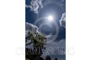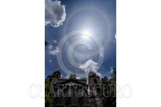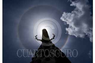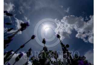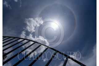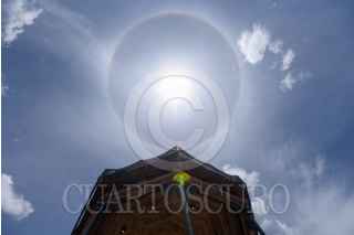 TOLUCA, ESTADO DE MÉXICO, 10 JULIO 2025.- En la capital mexiquense se pudo observar un halo solar, un fenómeno óptico, formando un anillo de luz alrededor del sol con colores similares al del arcoíris. Se registra por la refracción de luz solar a través de cristales de hielo en las nubes. FOTO: CRISANTA ESPINOSA AGUILAR/CUARTOSCURO.COM