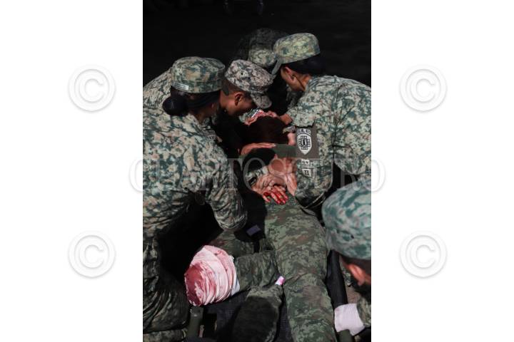 SAN MIGUEL DE LOS JAGUEYES, EDOMEX, 10JULIO2025.- Cadetes del Heróico Colegio Militar practican una situación de emergencia con soldados heridos en combate. FOTO: DANIEL AUGUSTO/ CUARTOSCURO.COM