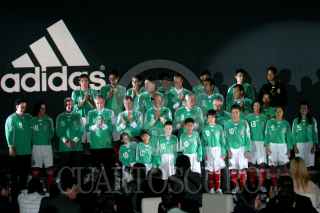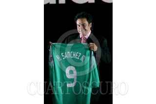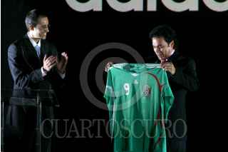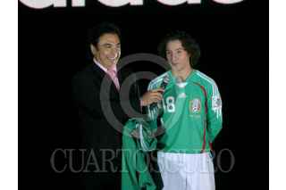 MÉXICO, D.F., 12NOVIEMBRE2007.- El técnico nacional Hugo Sánchez y el jugador del Deportivo La Coruña, Andrés Guardado, mostraron la nueva playera que portará el conjunto mexicano. FOTO: ISAAC ESQUIVEL/CUARTOSCURO.COM