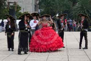 CIUDAD DE MÉXICO 12JULIO2025.- Una quinceañera acompañada de sus chambelanes y damas de honor con temática de mariachi, se ven sorprendidas por manifestación en pro de la Paz en el Mundo en el Monumento a la Revolución. FOTO: ROGELIO MORALES /CUARTOSCURO.COM