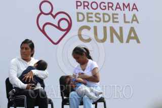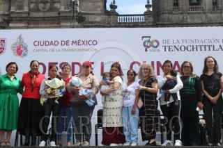 CIUDAD DE MÉXICO, 14JULIO2025.- Clara Brugada, jefa de Gobierno, entregó el apoyo del programa "Desde la Cuna", a una madre acompañada de su bebé en la plancha del Zócalo. El programa social consiste en brindar un apoyo económico universal para los primeros años de vida, por lo que las infancias de 0 a 3 años 10 meses recibirán transferencias monetarias por mil pesos en una sola ministración de manera bimestral. FOTO: GRACIELA LÓPEZ/CUARTOSCI.COM