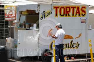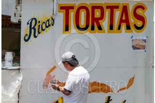 CIUDAD DE MÉXICO, 14JULIO2025.- Poco a poco regresan los rótulos en los puestos de tortas y jugos en la alcaldía Cuauhtémoc, esto luego de que en la administración de Sandra Cuevas como alcaldesa de Cuauhtémoc los prohibiera y en su lugar ordeno que todos estos puestos se pintarán de blanco con el logo de la alcaldía, aludiendo al orden visual. En la calle de Dr. Velasco un rotulista pinta una torta para atraer a los comensales. FOTO: MOISÉS PABLO/CUARTOSCURO.COM