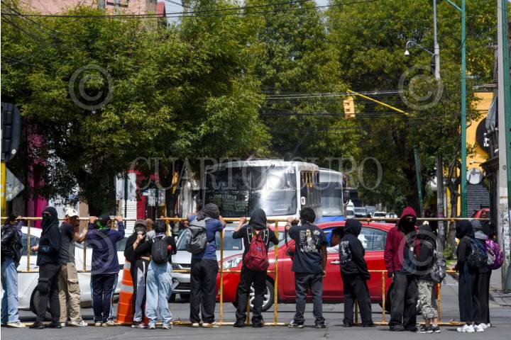 TOLUCA, ESTADO DE MÉXICO, 14JULIO2025.- Integrantes del Enjambre Estudiantil Unificado bloquearon la avenida Instituto Literario ante la negativa de acudir a la Casa del Estudiante de las candidatas a rectoras de la UAEMéx no reconocen la legitimidad del proceso electoral en curso, así como posponer el proceso de elección que se realizará el 15 de julio y pasarlo hasta el 6 de agosto. FOTO: CRISANTA ESPINOSA AGUILAR/CUARTOSCURO.COM