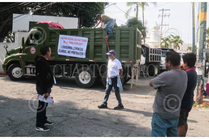 CUERNAVACA, MORELOS, 15JULIO2025.- Decenas de choferes de camiones de carga adheridos al Nuevo Grupo Sindical protestan cerrando con sus unidades varias calles que rodean en Palacio Municipal en el centro de la ciudad. Exigen al gobierno municipal transparencia en la asignación de obras, ya que desde hace meses han recibió desdén y falta de cumplimiento. La protesta genera caos vial en la ciudad. FOTO: MARGARITO PÉREZ RETANA/CUARTOSCURO. COM