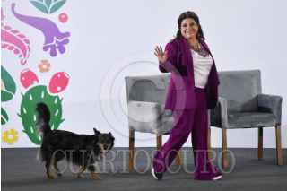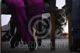 CIUDAD DE MÉXICO, 15JULIO2025.- "Iztli" animal de compañía de Clara Brugada, jefa de Gobierno, espera detrás de su dueña mientras se realiza la reunión "Zócalo de Gobierno Ciudadano" en la que se escuchan las demandas sociales de algunos capitalinos. FOTO: MARIO JASSO/CUARTOSCURO.COM