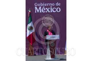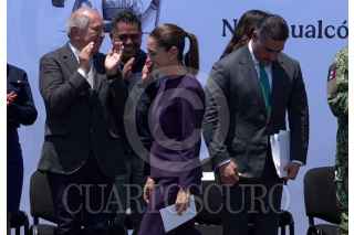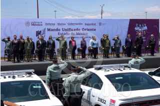 NEZAHUALCÓYOTL, ESTADO DE MÉXICO, 16JULIO2025.- Delfina Gómez, gobernadora del Estado de México,Claudia Sheinbaum, presidenta de México y Rosa Icela Rodríguez, Secretaria de Gobernación, durante la presentación del Mando Unifocado Oriente Estado de México en el Municipio de Nezahualcóyotl. FOTO: ROGELIO MORALES /CUARTOSCURO.COM