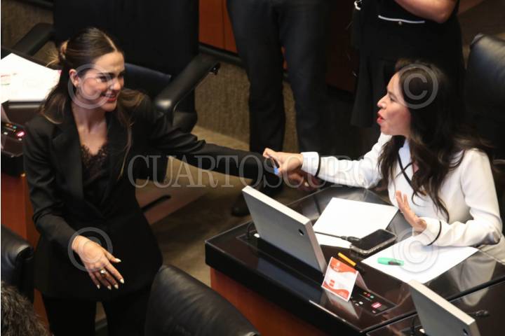 CIUDAD DE MÉXICO, 16JULIO2025.- Las senadoras Andrea Chávez y Simey Olvera se saludaron durante la Sesión de la Comisión Permanente en el Senado de la República. FOTO: GRACIELA LÓPEZ/CUARTOSCURO.COM