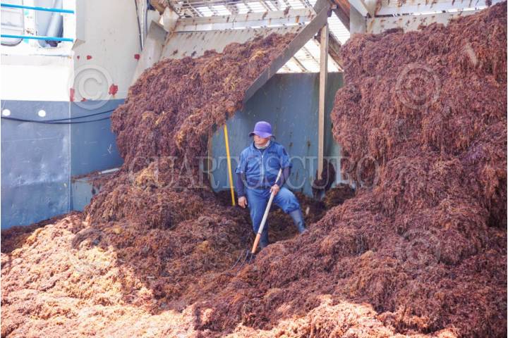PUERTO MORELOS, QUINTANA ROO, 16JULIO2025.- El buque interoceánico NATAN de la Marina, encabezado por el contraalmirante Topiltzin Flores Jaramillo, está encargado de la recolecta el sargazo en altamar. La embarcación se encuentra en Puerto Morelos combatiendo el intenso recale de esta macroalga. FOTO: ELIZABETH RUIZ/CUARTOSCURO.COM