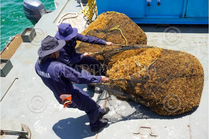 PUERTO MORELOS, QUINTANA ROO, 16 DE JULIO DE 2025.– El buque interoceánico NATAN de la Secretaría de Marina, al mando del contraalmirante Topiltzin Flores Jaramillo, realiza labores de recolección de sargazo en altamar. La embarcación opera con una red especializada para capturar la macroalga antes de su arribo a la costa de Puerto Morelos. FOTO: ELIZABETH RUIZ / CUARTOSCURO.COM