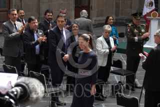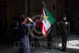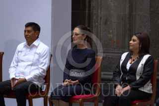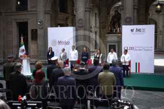 CIUDAD DE MÉXICO, 18JULIO2025.- Salmón Jara, gobernador de Oaxaca, Claudia Sheinbaum, presidenta de México y Clara Brugada, jefa de Gobierno, durante el 153 Aniversario Luctuoso de Benito Juárez, desde Palacio Nacional. FOTO: ROGELIO MORALES /CUARTOSCURO.COM