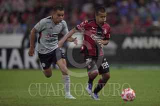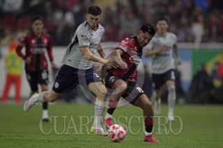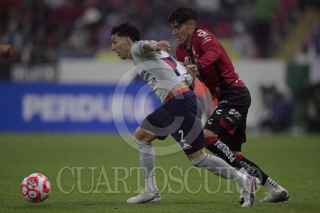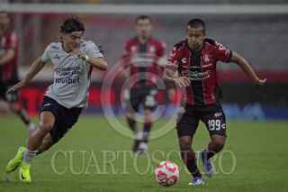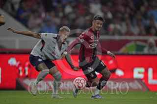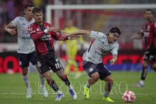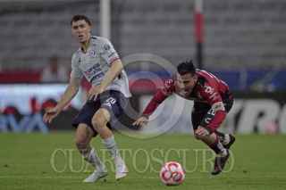 GUADALAJARA, JALISCO, 19JULIO2025.- Aldo Rocha, jugador de Atlas, disputa el balón con el contrario de Cruz Azul, José Paradela, esto en partido correspondiente a la jornada 2 del Torneo Apertura 2025 de la Liga MX, en donde se enfrentan los equipos de Atlas vs Cruz Azul, en juego que se lleva a cabo en el Estadio Jalisco, el marcador al momento es de 2-2. FOTO: FERNANDO CARRANZA GARCIA / CUARTOSCURO.COM