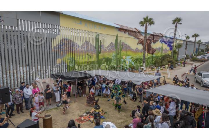 TIJUANA, BAJA CALIFORNIA 19JULIO2025.-Con danza mexica y participación de comunidades indígenas, se inauguró el mural “Abrazo Mutuo” en el Parque de la Amistad, en Playas de Tijuana. La obra, liderada por el artista Alfredo Libre Gutiérrez, mide alrededor de 60 metros de largo y simboliza la unión entre el Norte y el Sur del continente, inspirada en la profecía del Águila y el Cóndor. Pintado por un colectivo de 10 artistas, incluidos miembros de la comunidad Kumiai, el mural mezcla paisajes, símbolos y flora local. Financiado por una fundación de Los Ángeles, busca promover la paz, el arte urbano y la identidad fronteriza. FOTO OMAR MARTÍNEZ / CUARTOSCURO.COM