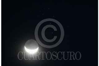 CUERNAVACA, MORELOS, 20JULIO2025.- Día Internacional de la Luna, rememorando la llegada del hombre al satélite en la misión Apolo 11 en 1969. En la imagen, la luna en su fase menguante, iluminada en un 24 % pasa cerca del cúmulo de estrellas de Las Pléyades, durante la madrugada de este día. A simple vista se pueden observar seis luceros, pero al acostumbrarse la vista se descubren más estrellas, todas de un color azul y muy brillantes. FOTO: MARGARITO PÉREZ RETANA/CUARTOSCURO.COM