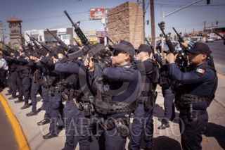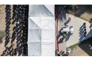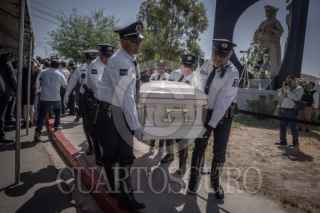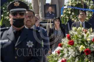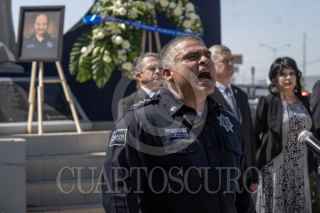 MEXICALI, BAJA CALIFORNIA, 21 JULIO 2025.- En la explanada de la Secretaría de Seguridad Pública Municipal (SSPM) se realizó un homenaje fúnebre en honor al subcomandante Roberto Méndez Arreola, quien falleció el 14 de julio frente a su domicilio. En la ceremonia participaron familiares, compañeros y autoridades, e incluyó una guardia de honor encabezada por su esposa e hija. La alcaldesa de Mexicali, Norma Bustamante, informó que el Ayuntamiento brindará apoyo a la familia, mientras que la Fiscalía lleva a cabo la investigación correspondiente. También se realiza una indagatoria interna relacionada con la desaparición del teléfono móvil del oficial. La alcaldesa estuvo presente durante el acto. FOTO: OMAR MARTÍNEZ / CUARTOSCURO.COM