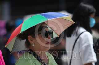 CIUDAD DE MÉXICO, 22JULIO2025.- Una mujer se cubre de los rayos del sol con una bolsa de plástico durante su transito por el Centro Histórico. FOTO: GRACIELA LÓPEZ/CUARTOSCURO.COM