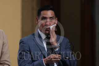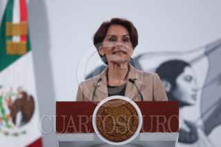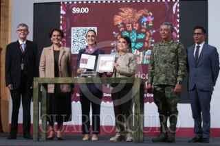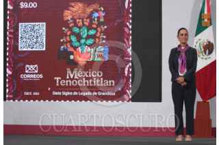 CIUDAD DE MÉXICO, 23JULIO2025.- Alfonso Suárez del Real, asesor político de Comunicación Social de Presidencia de la República; Violeta Abreu González, directora del Servicio Postal Mexicano (Sepomex); Claudia Sheinbaum, presidenta de México; Clara Brugada, jefa de Gobierno; Raymundo Pedro Morales, secretario de Marina, y Miguel Elorza Vásquez, coordinador de Infodemia, mostraron el nuevo timbre en conmemoración a a los 700 años de la fundación de México-Tenochtitlán durante la conferencia del pueblo realizada en el Salón Tesorería en Palacio Nacional. FOTO: GRACIELA LÓPEZ/CUARTOSCURO.COM